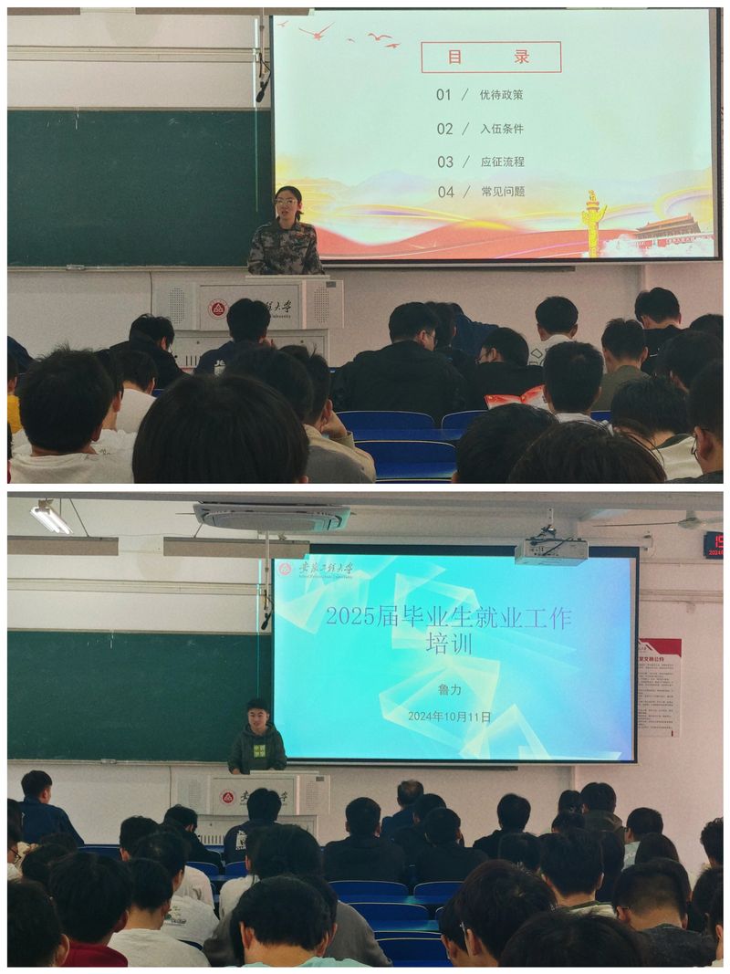 鲁力进行毕业生就业工作培训,详细介绍了安徽省大学生就业系统的操作流程和注意事项,确保每位毕业生都能熟练掌握系统,为接下来的求职之路打下坚实基础。赵成婧详细解读了最新的征兵入伍政策,包括报名条件、选拔流程、优惠政策等方面,强调工科毕业生具有专业对口的优势,入伍后发展潜力大。三名退役复学学生分享了入伍经历与收获,号召大家积极报名入伍,提升自我,报效祖国。