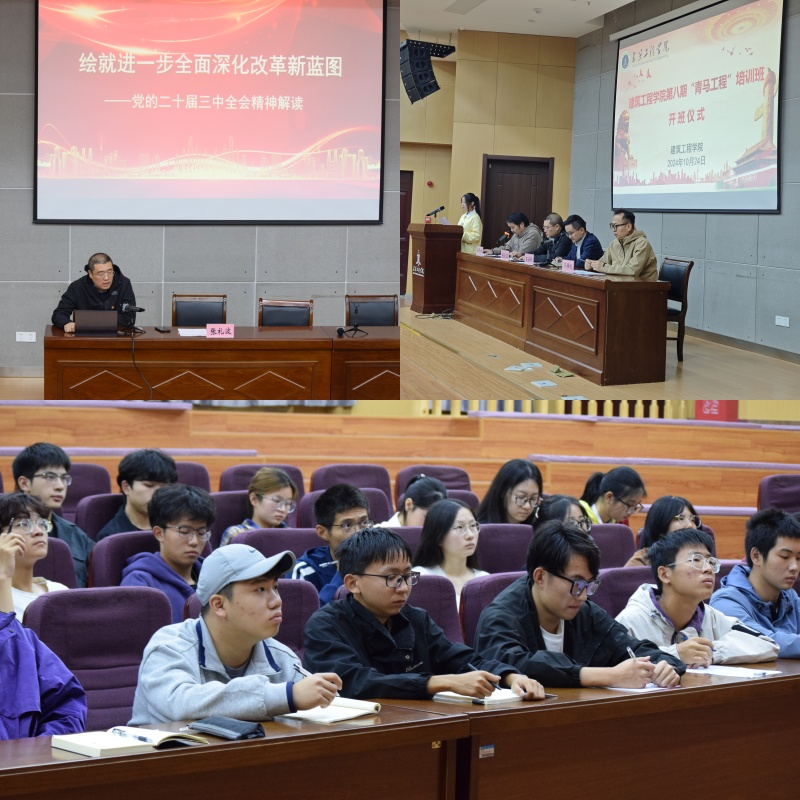 仪式在庄严的国歌声中开始。王海明在仪式上作了讲话。他对入选青年马克思主义培养工程培训班的同学表示祝贺,结合党的二十届三中全会精神,深刻阐释了对青马班的认识和想法,鼓励青马班学员珍惜机会,认真学习;深入思考,勇于实践;严于律己,树立榜样,争做“理论先锋、标兵骨干和青年表率”。苏伟刚介绍了院第八期“青马工程”培训班基本情况及管理规定。黄贤君宣读了培训班班委及人员分组情况。学员代表建筑241马玥同学在发言表示,要按照“三全六专”的育人要求,以饱满的热情、坚定的信念、务实的作风投入到青马工程的学习和实践中,努力成为信仰坚定、能力突出、素质优良、作风过硬的青年政治骨干。院文艺团的同学们在仪式上表演了富有感染力的朗诵《我骄傲,我是中国人》。仪式在催人奋进的《光荣啊,中国共青团》歌声中结束。