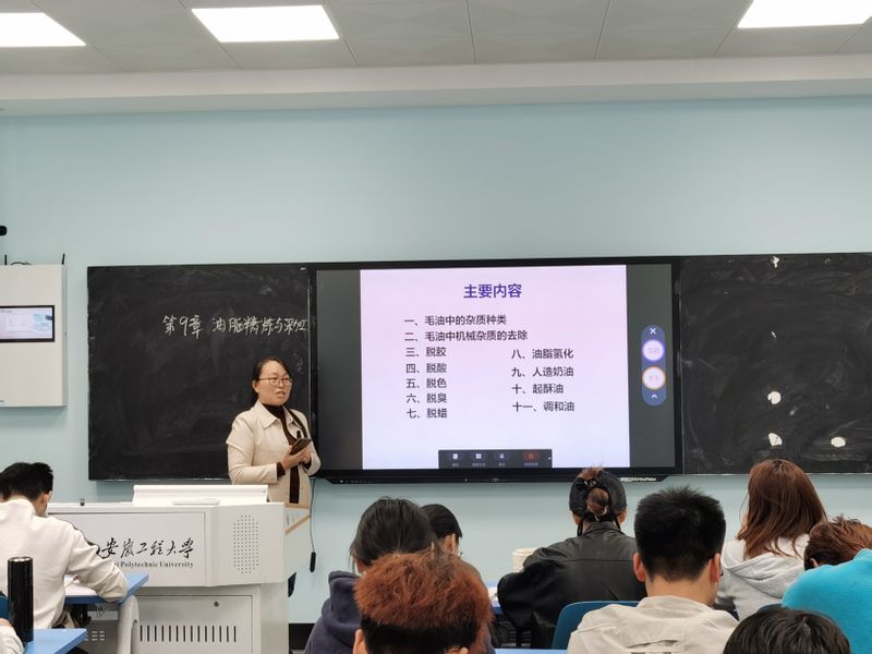 朱秀灵老师本次教学课程内容是《粮油加工工艺学》第九章油脂精炼与深加工。朱老师采用超星学习通与雨课堂相结合的授课模式,通过上节课知识点回顾,引发同学们的思考,导出本章节的学习内容。朱老师以毛油中的杂质种类以及各类杂质对油品质量、油脂加工及其对人体健康的影响,逐渐过渡到本章节的重点内容“油脂精炼和深加工”。在教学过程中,朱老师通过雨课堂发布投票、随堂练习、回答问题奖励积分等方式激发学生的学习兴趣,让学生在轻松学习课程知识的同时,从思想上重视食品安全。朱老师的讲解由浅入深,娓娓道来,期间善于和学生交流互动,深受学生欢迎,得到了一致好评。
