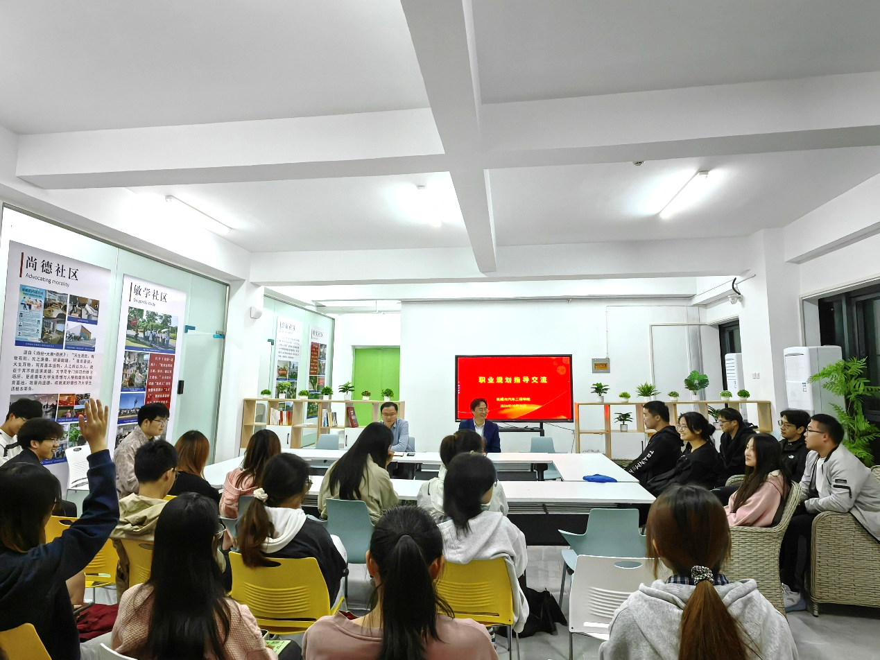 本网讯 10月26日,机械与汽车工程学院在国际工程师学院“一站式”社区梦溪驿站活动室举办“职业规划暨和谐社区建设”沙龙,和谐学生社区党委书记、大学生就业指导中心副主任郭全根、机械与汽车工程学院党委副书记秦广虎和新校区各班级学生代表参加。