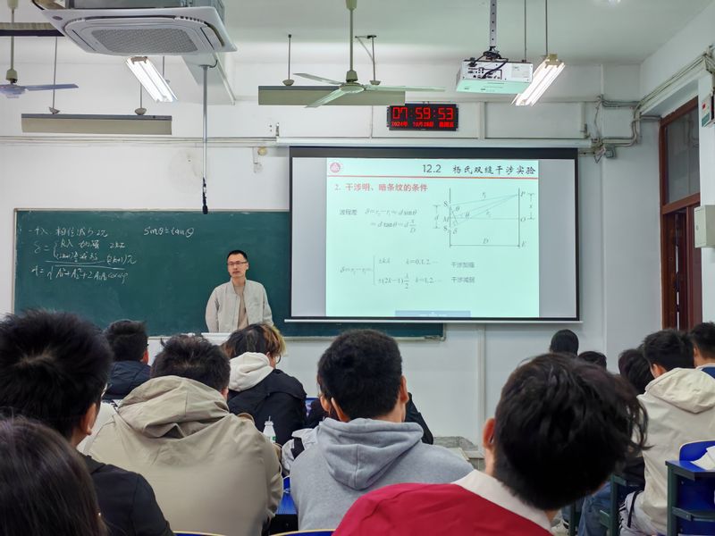 徐跟建带领大家复习了机械波的干涉,导入了杨氏双缝实验的现象与原理,引导大家深入探讨光的波动性这一科学问题。他借助日常生活中的实例进行细致深入的讲解,并与学生进行互动,有效激发了学生的学习兴趣和参与度,使得原本枯燥的知识点变得生动有趣,课堂氛围既严谨又活泼。