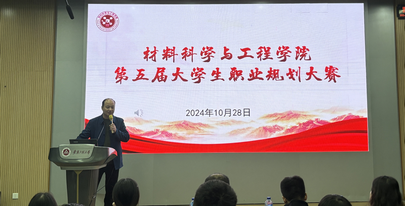 本网讯 为进一步落实“三全六专”育人实践,引导大学生树立正确的成才观、就业观和择业观,科学合理规划学业与职业发展,提升就业竞争力,10月28日晚,材料科学与工程学院在5J117举办第五届大学生职业规划大赛决赛。校团委教师兼职副书记姚伟波、设计学院团委负责人田潇濛、化环学院团委负责人王康、材料学院辅导员周冬梅、行管212班刘佳慧担任评委。学院党委副书记方玖胜、团委负责人田园、辅导员鲁力和全体新生参加活动。
