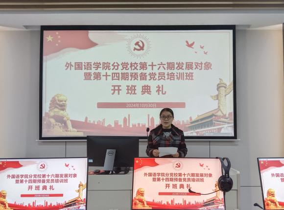 本网讯 10月30日,外国语学院第16期发展对象培训班暨第14期预备党员培训班开班仪式在9教103教室举行。校党校第三督导组组长许晓菁,学院党委副书记李校林,学院辅导员及全体学员参加开班仪式,仪式由培训班班主任陈小庆主持。
