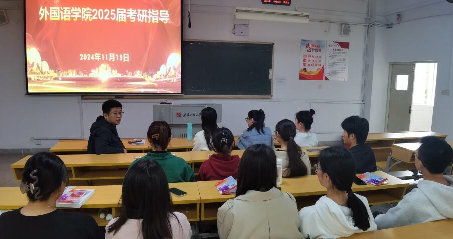 本网讯 为帮助2025届毕业生更好规划未来,明确就业方向,11月13日,外国语学院在4教213举办“筑梦之路 师长护航”考研指导暨征兵动员会。省级优秀教师、省级卓越教学新秀朱琪,省级教坛新秀苏涛,校武装部赵成婧应邀为学院2025届本科毕业生做专题指导。