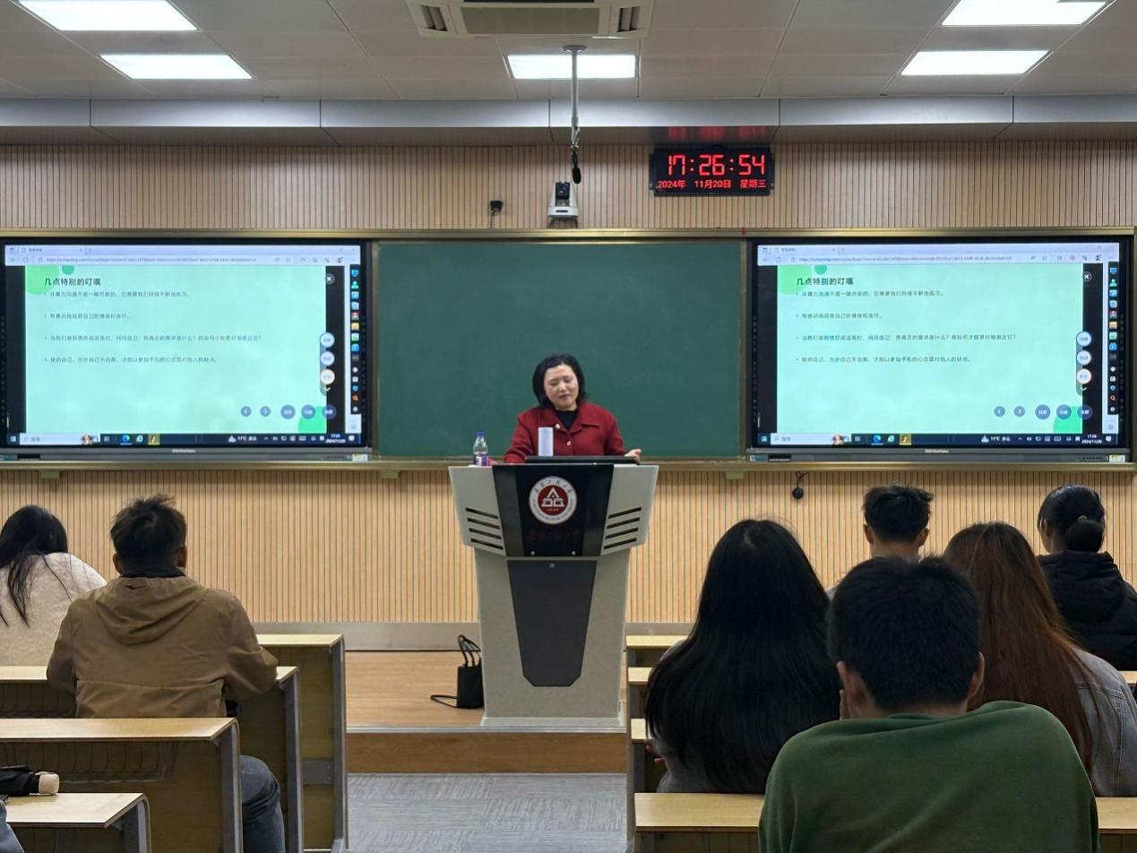 交流环节,同学们纷纷积极提问,就非暴力沟通的具体细节和实践方法进行了深入的探讨。蒋艳耐心解答了同学们的问题,并鼓励大家在日常生活中积极实践这一沟通方法。本次分享会让同学们认识到了如何面对压力和挫折、培养健康的心理状态、运用非暴力沟通改善人际关系和提升生活质量。