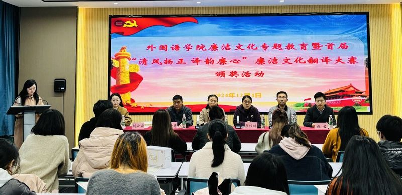 本网讯 为加强学院廉洁文化品牌建设,强化党员廉洁自律意识,激发学生用外语讲好廉洁文化故事的主动性和积极性,12月4日,外国语学院在9教209开展廉洁文化专题教育暨学院首届“清风扬正 译韵廉心”廉洁文化翻译大赛颁奖活动。校纪委办公室副主任、综合管理室主任汪丹莉,学院党委副书记、纪委书记李校林,学院纪委委员、学生党支部书记、学生党员和入党积极分子共计60余人参加活动。活动由学院组织员刘云云主持。