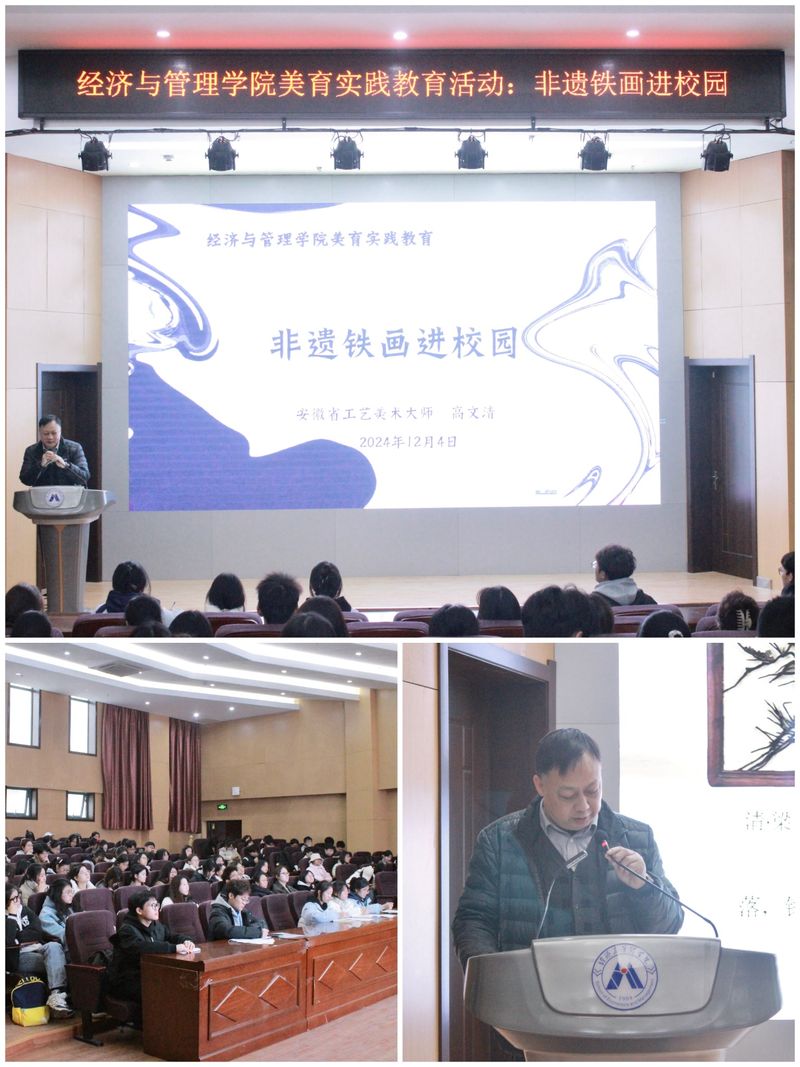 本网讯 为增进青年大学生对中华优秀传统文化的了解,感受非遗魅力,提升动手实践能力,经济与管理学院12月4日在c座7楼报告厅和一站式学生社区105室举办铁画宣传活动与铁画锻制技艺培训与体验活动。本次活动特邀安徽省工艺美术大师、芜湖市工艺美术协会会长高文清等多位芜湖铁画传承人莅临指导,经济与管理学院同学共同参与。