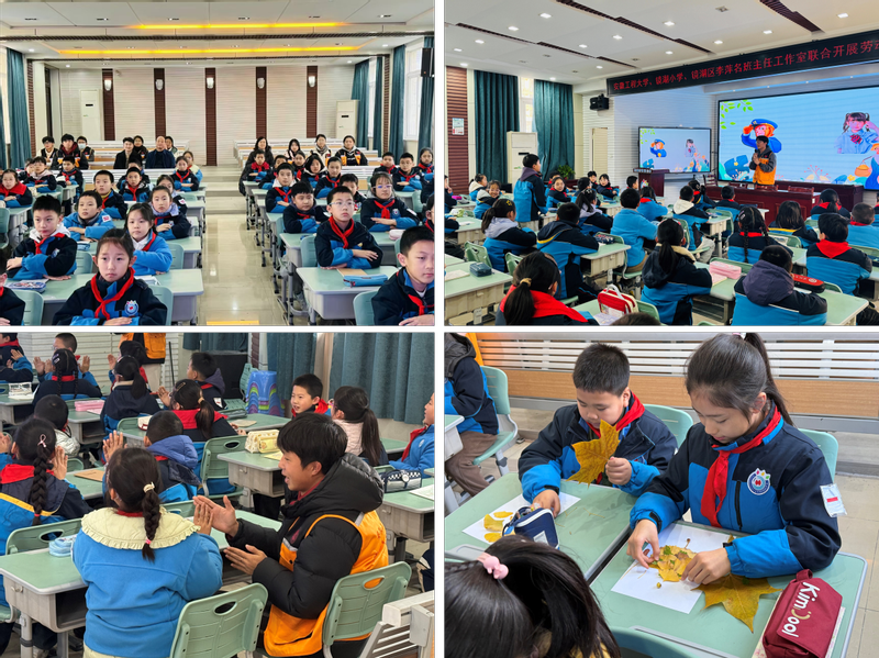 劳动教育先锋示范班班长侯睿祺为四年级学生上了一堂《劳动最光荣》的微课堂。他从劳动的由来及意义、劳动名言及歌曲等方面生动形象地讲述了劳动的基本知识,介绍了如何帮助父母做一些力所能及的小家务,用简单的小游戏激发同学们对劳动的思考。此外示范班成员还带着小朋友们体验落叶作画,现场欢声笑语。