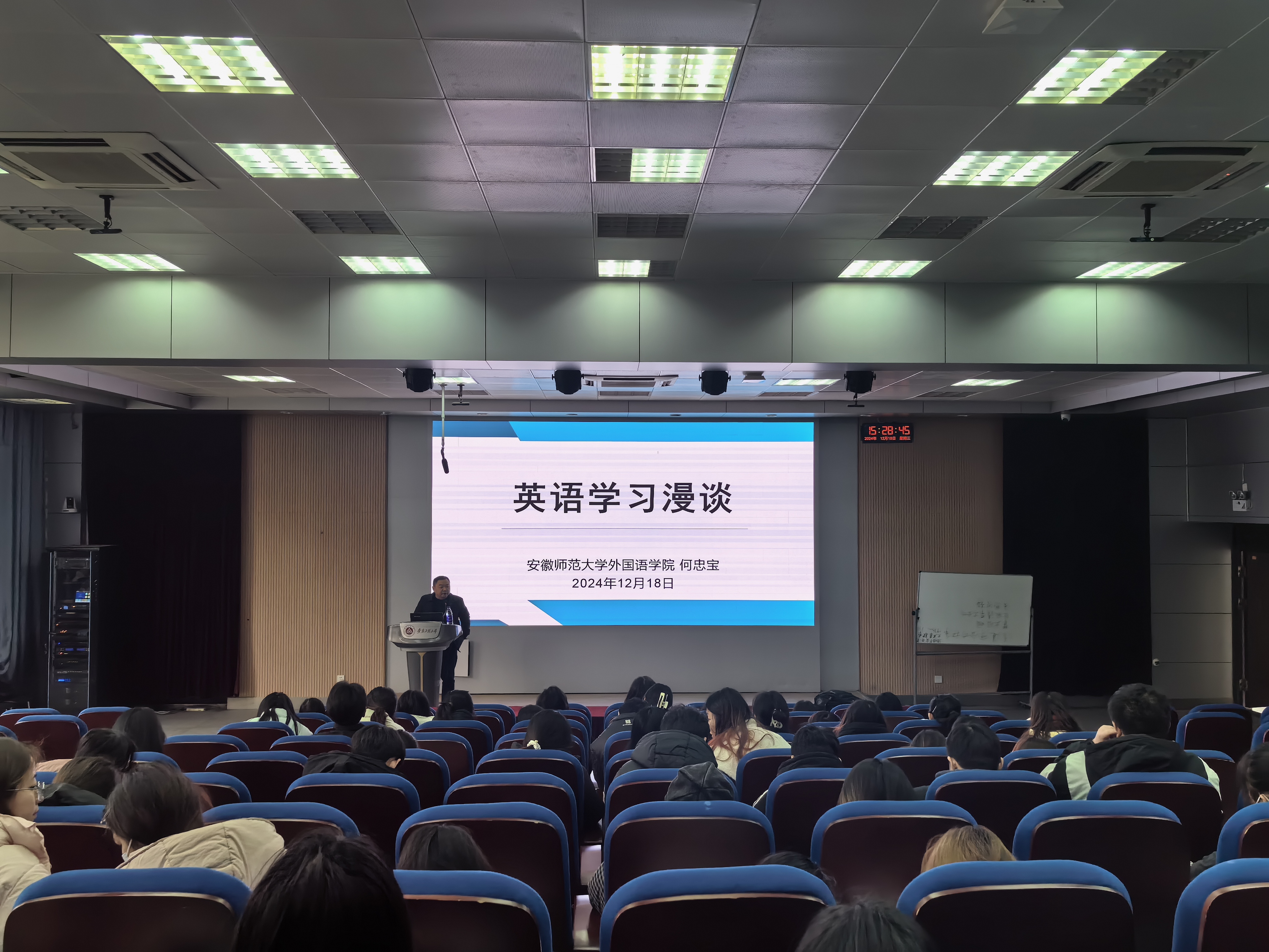本网讯 为推进学校个性化人才培养,拓展专业知识结构,提升专业素养,帮助同学们做好职业规划,夯实专业根基,12月18日,外国语学院邀请安徽师范大学何忠宝博士、安徽省金宁外事服务有限公司资深留学顾问易荣老师在5教117为英语专业22级和23级本科生开展“英语学习漫谈”和“职业发展和出国留学指导”讲座,学院副院长李新国参加会议,带班辅导员主持会议。