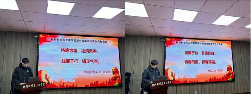 据悉,本次廉洁文化标语征集活动共收到来自全院学生党员、本科生、研究生的作品248件,经组织专家匿名评审推荐后,共评出优秀作品12件,根据各集体参与情况评选出优秀组织奖3个。材料科学与工程学院将持续做好廉洁教育活动,营造积极向上、清正廉洁的校园文化氛围。
