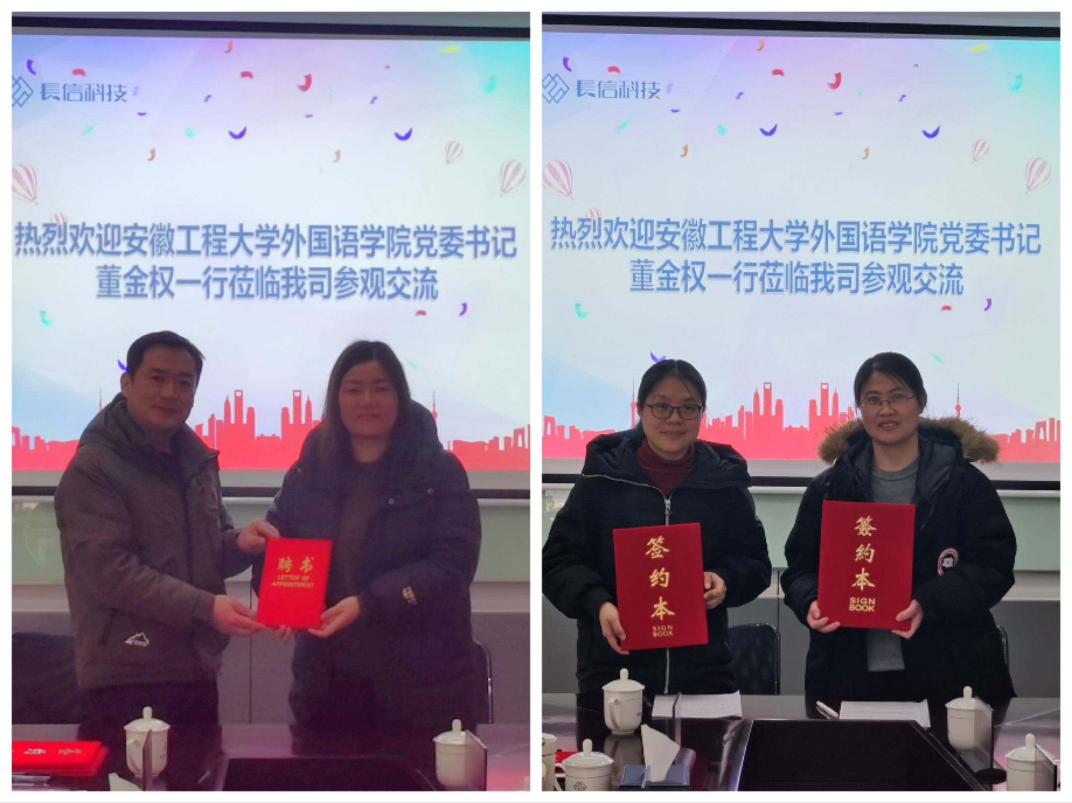 以党建共建推动合作共赢。在长信科技股份有限公司,黄红和鲁静分别从企业发展历程、人才需求情况等方面做了详细介绍。董金权代表学院党委对公司的接待表示感谢,并简要介绍了学院的党建工作、学科和专业设置等情况。李校林对学院毕业生就业情况做了分析和说明。李新国就学院打造“企业课堂”引入企业资源提升人才培养质量情况做了介绍。双方围绕“党建促发展”开展深入交流,在党建引领发展、赋能人才培养等方面达成合作共识。现场,李校林与中共芜湖长信科技股份有限公司委员会组织委员徐娇签署党建共建合作协议。董金权向鲁静颁发“企业课堂”导师聘书。