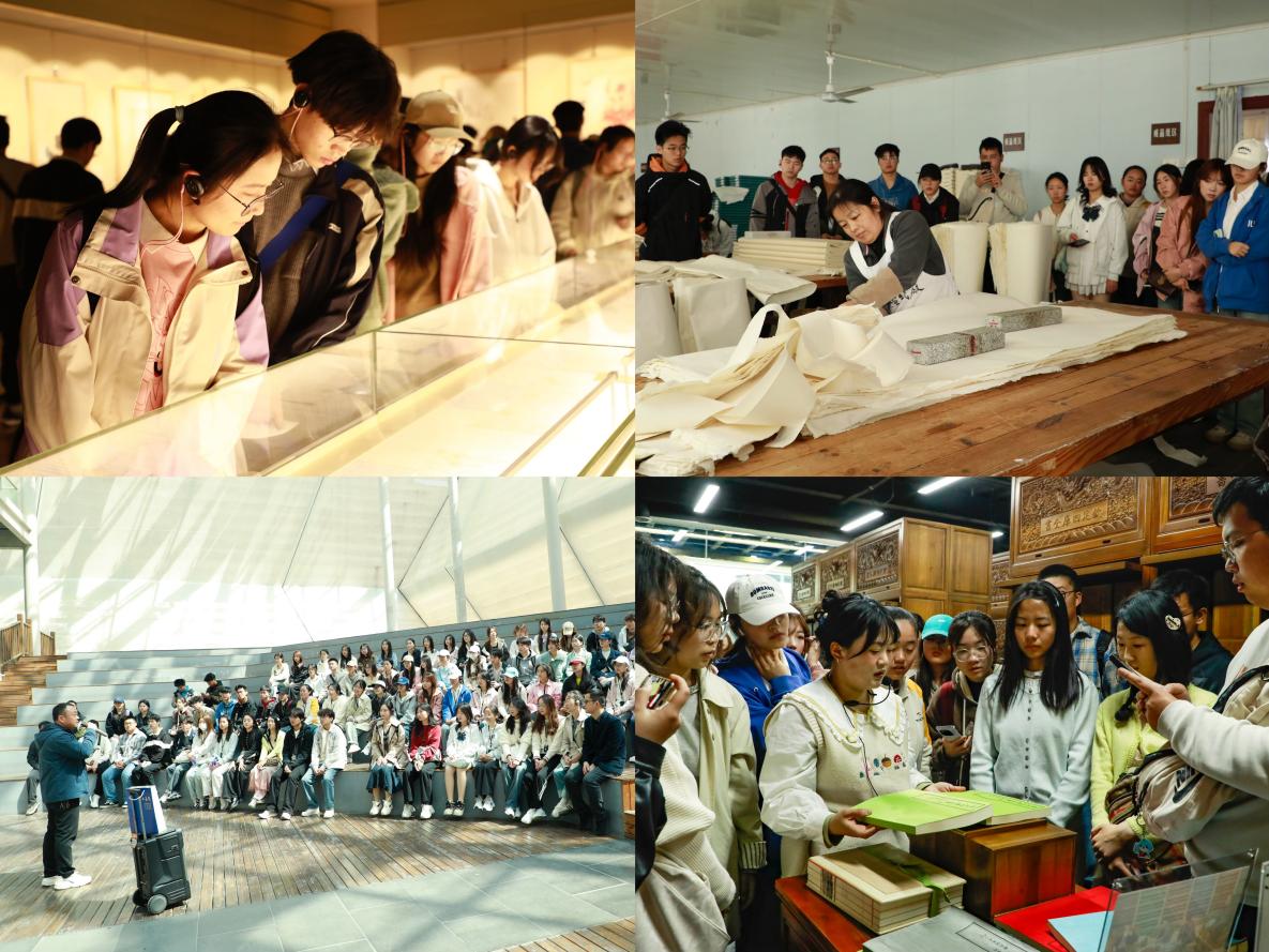 中国宣纸博物馆内,数字化展示与实物展品相结合,全方位展现了宣纸文化的深厚底蕴。在现场教学环节,刘艳以传统文化为主题,从微观、中观、宏观等角度阐释了宣纸文化中蕴含的中华美学精神,期望同学们肩负传承与弘扬中华优秀传统文化的使命,坚定文化自信,积极主动地成为中华优秀传统文化的传播者。参观过程中,同学们详细了解了宣纸制作技艺,深刻感受了宣纸制作中的工匠精神与传统文化的博大精深。