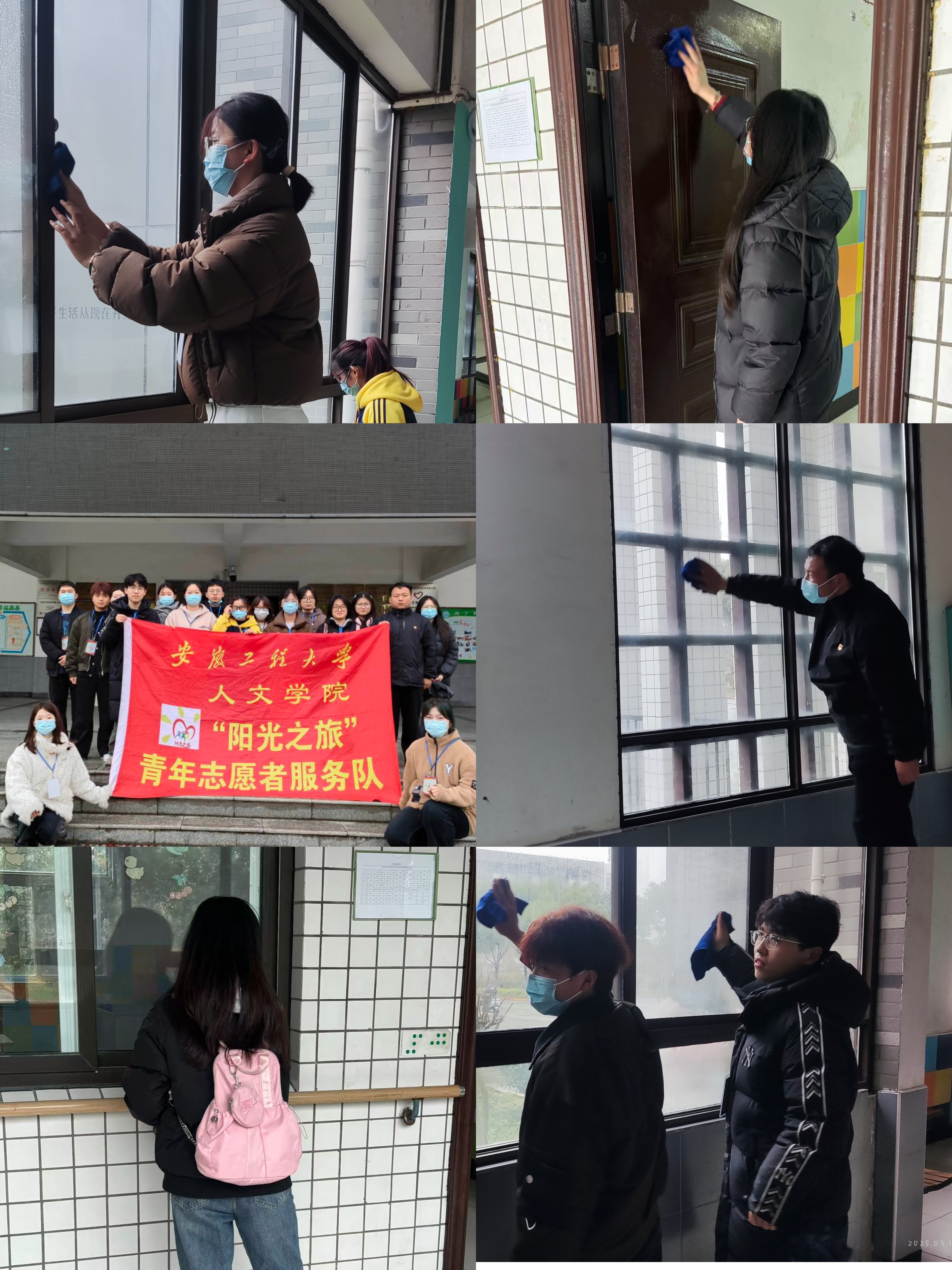 在芜湖市盲人学校,服务队联合学院行政管理专业学生党支部开展“山樱花”盲校志愿服务活动。活动现场,党员、团员志愿者们分工明确,手持抹布等清洁工具,仔细擦拭桌椅、清理讲台、扫地、擦窗……教室、宿舍、公共区域都变得干净整洁,并与盲校师生交流学生的学习和生活状况,受到了盲校师生的一致好评与衷心感谢。