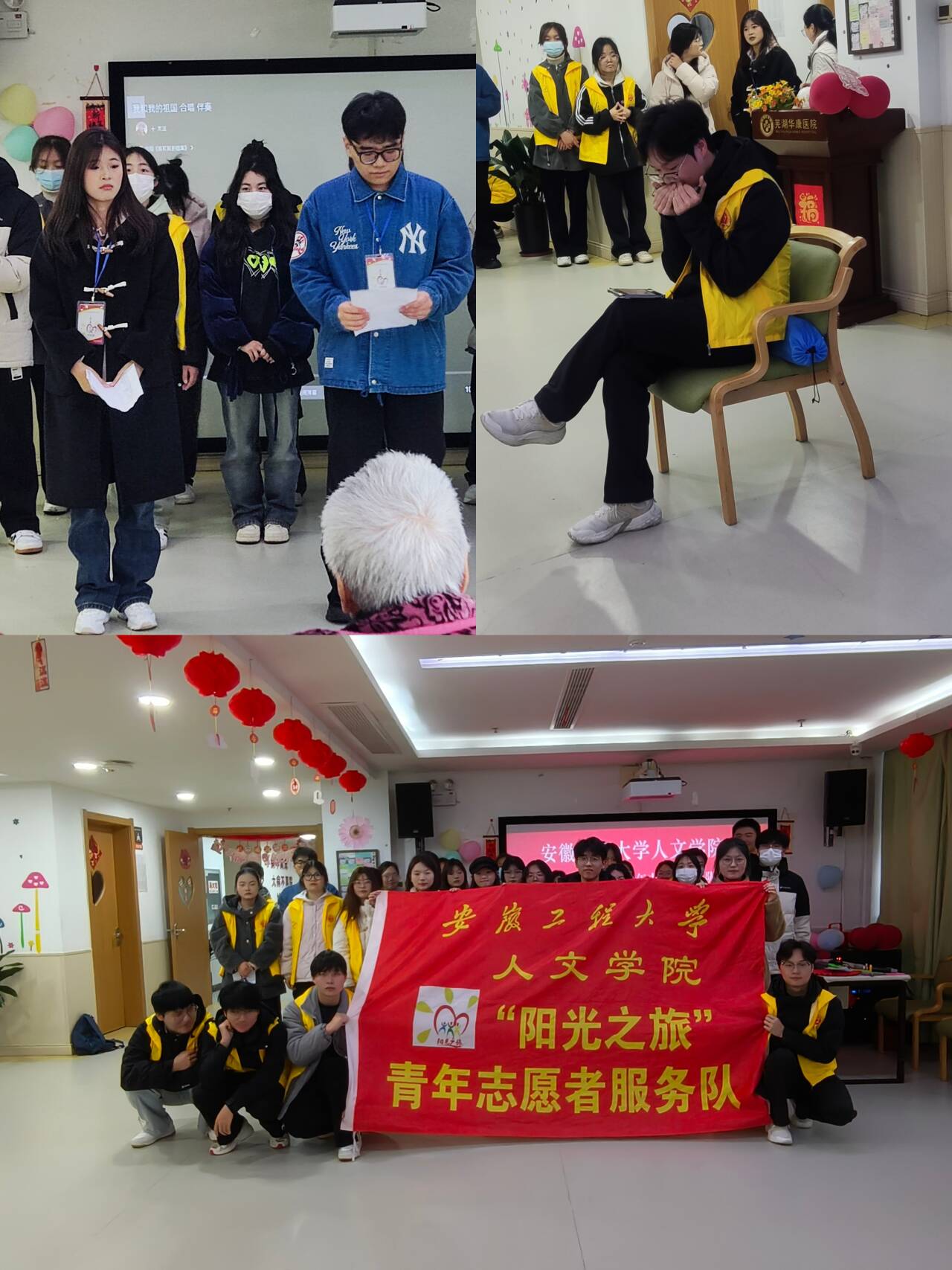 在鸠江区官陡街道星辰社区芜湖华康长者智慧安养中心,服务队联合“清源花”志愿团队开展关爱老人志愿服务活动,志愿者们展示了精心准备的歌唱、舞蹈等节目,并开展金龙拍拍操、趣味手指操教学活动,为老人们带去温暖与欢笑,帮助老人们增强自我保健意识。