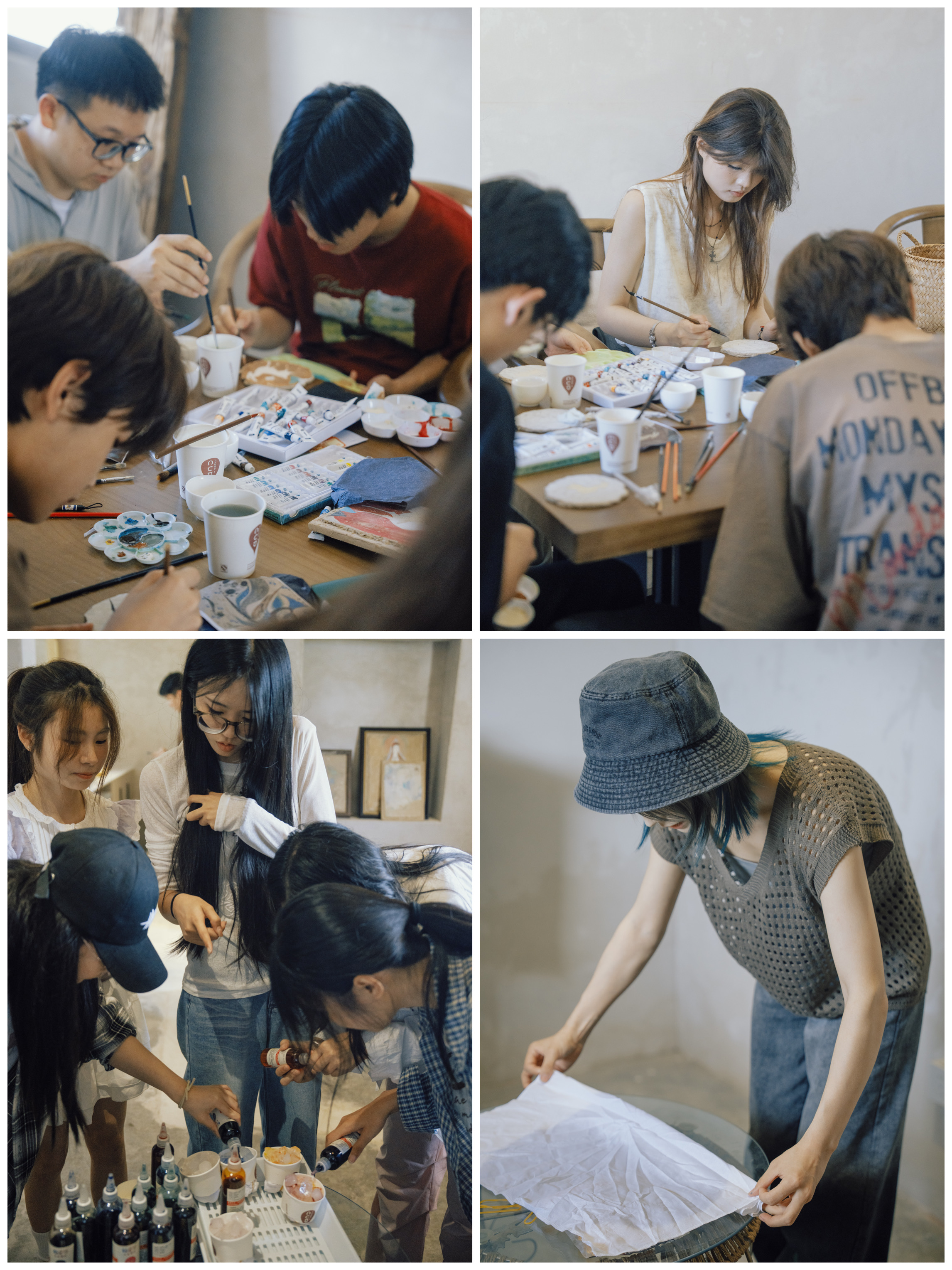 活动现场,同学们在服装系教师孙旭之的指导下,分别参与了泥板画绘制和冰染工艺制作。通过绘制具有传统壁画风格的泥板画,同学们不仅了解了中国古代壁画的艺术特色与文化内涵,也锻炼了动手与审美能力;在冰染体验环节,同学们运用冰块和扎染技法结合,创作出独具匠心的染色作品,感受传统工艺与自然之美的融合。