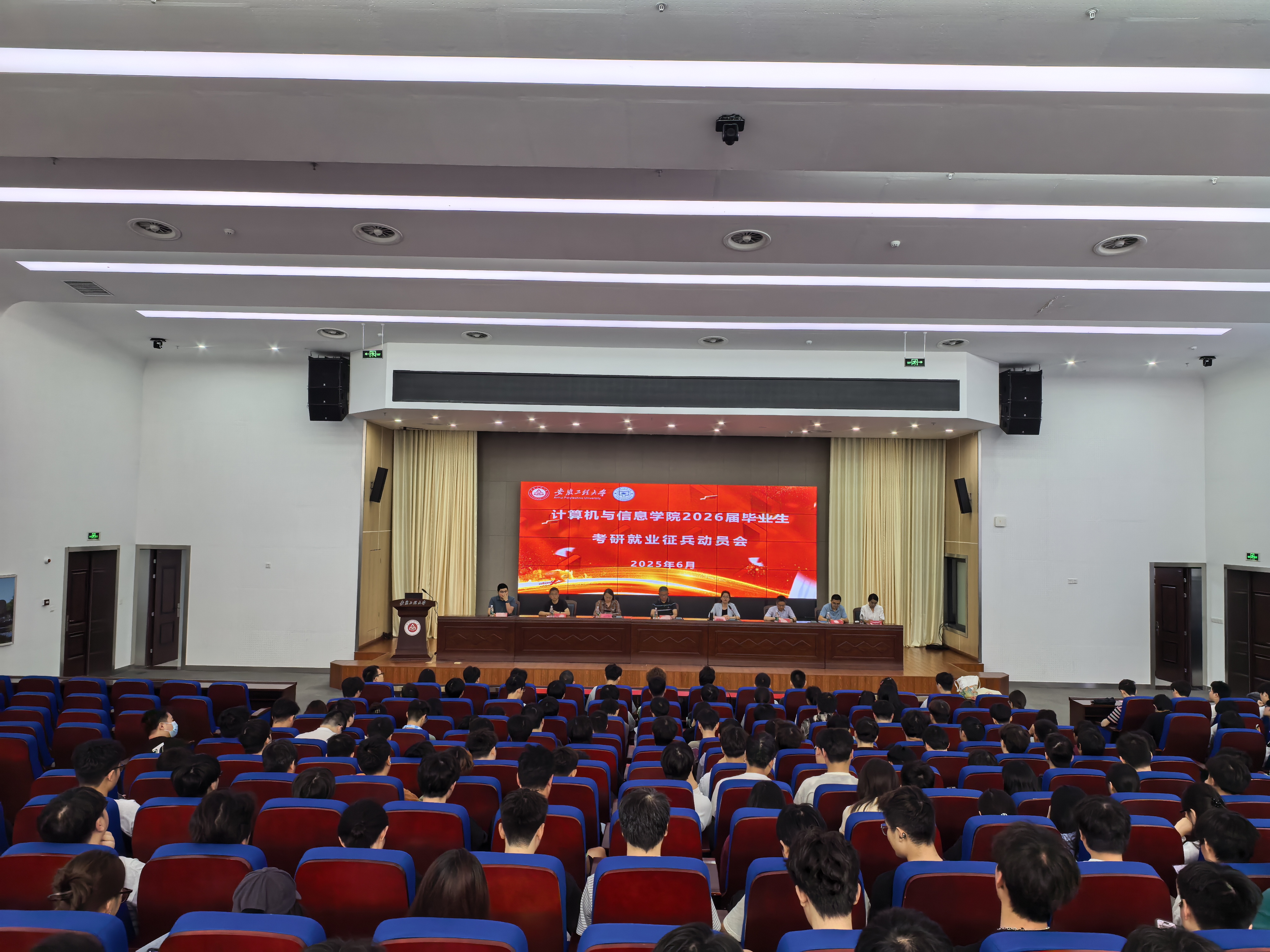 本网讯 6月12日,计算机与信息学院在图书馆5楼会议室召开2026届本科生考研就业征兵动员会,院党委书记李烨、院党委副书记孙德茹、副院长刘涛、院长助理严楠、学生处赵成婧、各系主任、毕业班辅导员及300余名2026届本科生参加,会议由孙德茹主持。