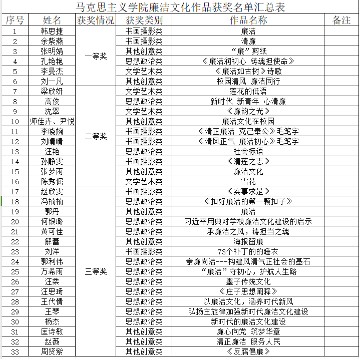 为深入学习宣传贯彻党的二十届三中全会精神和习近平总书记考察安徽重要讲话精神,认真贯彻落实中共中央办公厅印发的《关于加强新时代廉洁文化建设的意见》,积极推进学院廉洁文化建设,结合学院实际,我院组织开展廉洁文化作品征集活动。经学院评选,共计评出一等奖六名、二等奖十名、三等奖十七名,现将评选结果公示如下: